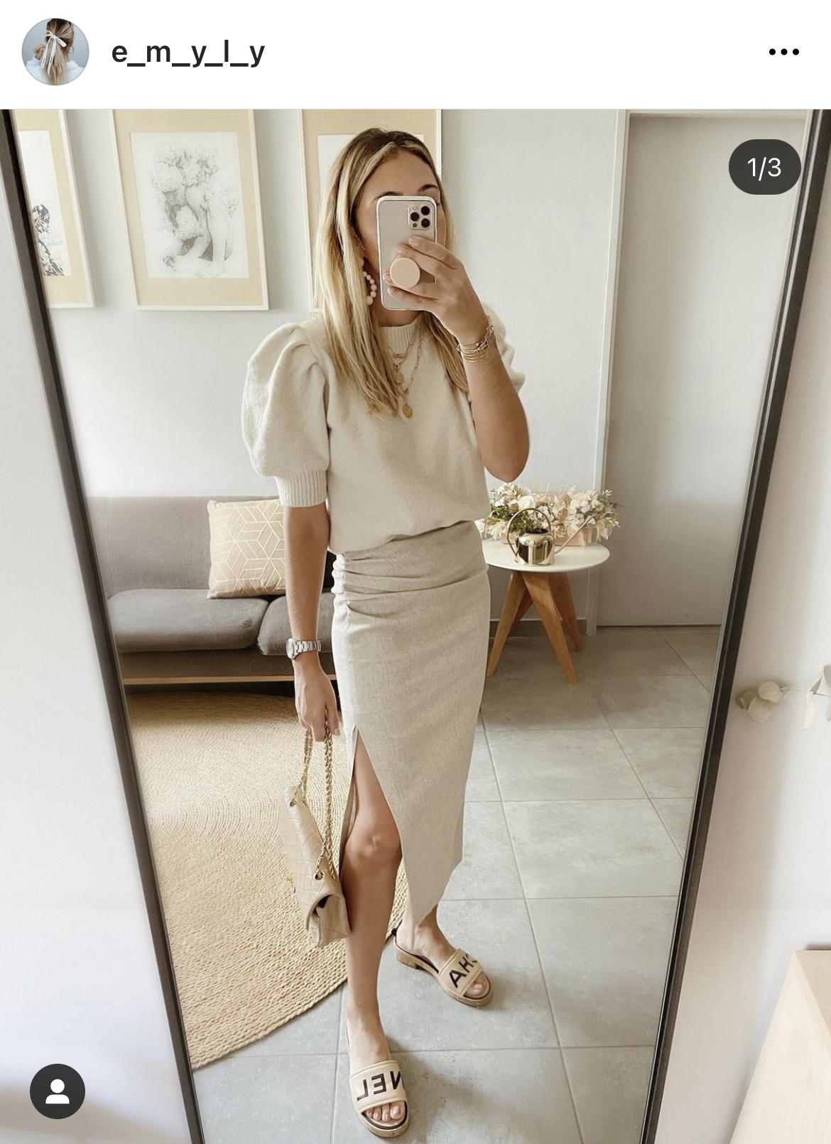 Émilie : C’est trois looks réunissent ce que j’aime, confort, couleurs neutres, avec des pièces fortes (haut à manches bouffantes) et des jolis détails (froncé de la jupe). Ce sont aussi des looks que tu mets la journée, et qui se transforment version “night” en un changement de chaussures !