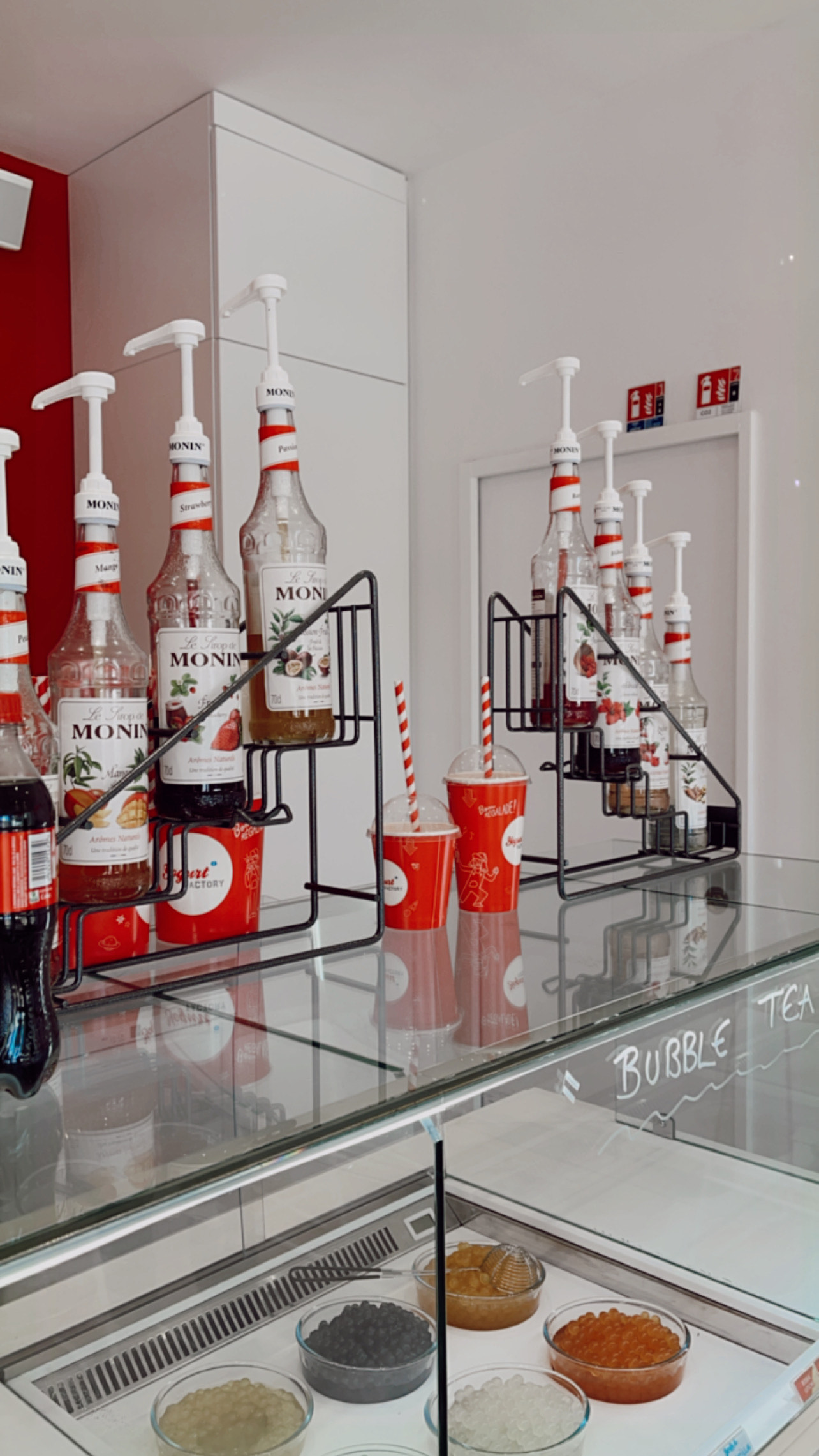 Chez Yogurt Factory on choisit entre trois tailles de pots : le mignon, le beau et le magnifique. Deux parfums sont disponibles, l’un est classique et présent en permanence, l’autre est une création limitée renouvelée chaque semaine. On couvre son yaourt glacé de toppings, des fruits, des noisettes, du Kinder Bueno, des coulis gourmands… On a le choix en terme de régalade et tout est absolument modulable à souhait.